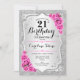 Invitation du 21e anniversaire. Design floral élégant en argent et rose. Comprend des bandes d'argent fausse parties scintillant, rose rose rose police de script et confetti. Parfait pour une fête d'anniversaire glam.