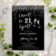 Invitation du 21e anniversaire. Salutations À 21 Ans ! Design élégant en noir, blanc et argent. Il comprend des verres à champagne, des caractères de script et des confettis en argent parties scintillant. Parfait pour une fête d'anniversaire élégante. Personnalisez avec vos propres détails. Peut être customisé pour montrer n'importe quel âge.