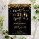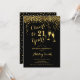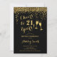 Invitation du 21e anniversaire. Salutations À 21 Ans ! Design élégant en noir et or. Il comprend des verres à champagne, des caractères de script et des confettis. Parfait pour une fête d'anniversaire élégante. Personnalisez avec vos propres détails. Peut être customisé pour montrer n'importe quel âge.