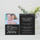 Invitez vos invités avec cette invitation pour 25 ans de mariage avec une bordure de confettis argentés et une typographie rétro indiquant 25 ANS DE FABRICATION avec leur année de mariage intégrée dans le design. Ajoutez une photo actuelle, leur portrait de mariage ou une photo de leurs jeunes années pour une invitation amusante avec un look du passé. Contactez le concepteur si vous souhaitez que ce design soit modifié ou sur un autre produit pour compléter votre ensemble de fête.