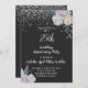 Une élégante invitation de fête d'anniversaire de mariage argenté 25 ans avec paillettes d'argent sur des bordures florales de roses noires et blanches et une typographie script blanche.