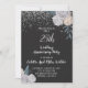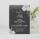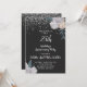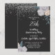Une élégante invitation de fête d'anniversaire de mariage de 25 ans avec paillettes d'argent sur des bordures florales de roses noires et blanches et une typographie script blanche.