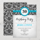 30th Birthday Invitation Design élégant avec damas noir et blanc et touche d'aqua bleu. Parfait pour une fête du trentième anniversaire féminin. Peut être customisé pour n'importe quelle année !