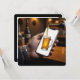 La main d'un homme tient un smartphone montrant l'image d'une tasse de bière alors que la bière est déversée d'une bouteille dans la tasse créant un mélange surréaliste de technologie et de réalisme pour un invitation de fête du 35e anniversaire. Tout le texte peut être modifié.