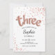 Invitation de 3e anniversaire pour fille. Design d'or rose blanc féminin avec confettis de parties scintillant faux. Dispose de rayures et de ballons à la mode lettres trois. Parfait pour un troisième anniversaire élégant. Message-moi si vous avez besoin d'une personnalisation plus poussée.