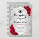 Invitation du 40e anniversaire. Design floral élégant en argent et rouge. Comprend des bandes d'argent faux parties scintillant, des roses rouges police de caractères stylisés et des confettis. Parfait pour une fête d'anniversaire glam.
