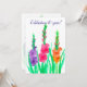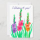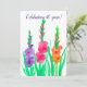 Une invitation de fête d'anniversaire de mariage fleurie décorée de trois fleurs de gladiolus vibrantes en pourpre, rose et orange avec des feuilles vertes brillantes peintes à l'aquarelle. Dans le langage des fleurs, le gladiolus signifie "vous percez mon cœur" et force de caractère. C'est aussi la fleur traditionnelle du 40e anniversaire de mariage.