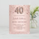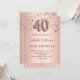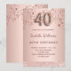 Une invitation moderne, élégante et glamour pour une fête de 40e anniversaire. Un arrière - plan métallique à l'or rose faux avec de l'or rose et des étoiles à gouttes roses et une bande de parties scintillant. Le nom est écrit avec un rose moderne de couleur or foncé à la main écriture style. Personnalisez et ajoutez les détails de votre fête. Le numéro 40 est écrit avec une police de style ballon, script.