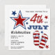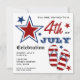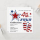 Une invitation 4 juillet illustrant une paire de tongs rouge blanc et bleu du drapeau américain en bas à droite. En haut à gauche se trouve une grande étoile rouge blanche et bleue avec de petites étoiles rouges et bleues éparpillées autour de l'invitation. Personnalisez le texte avec les détails de votre occasion.