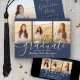 Partagez la joie d'un baccalauréat ou d'un collège et la famille et les amis invitations à célébrer avec ces 4 photos collage bleu marine et or invitations. Toutes les images et le libellé sont simples à personnaliser. (CONSEIL EN MATIÈRE DE PLACEMENT D'IMAGE : Une façon simple de centrer une photo exactement comment vous voulez est de la rogner avant de la télécharger sur le site Zazzle.) Ce modèle est formaté pour une fête de remise de diplômes, mais peut facilement être customisé comme un invitation ou une carte faire-part à domicile. Il vous suffit de modifier le texte pour y inclure tous les détails de votre choix, tels que les noms des parents, les distinctions spéciales, le titre du diplôme, la citation inspirante préférée, les plans futurs du diplômé ou la nouvelle adresse. S'il n'y a pas de texte non voulu simplement le supprimer. Le design comprend un arrière - plan bleu foncé, un casquette de tableau de mortier imitation feuille, une calligraphie manuscrite, une typographie minimaliste moderne et quatre photos de votre choix, telles que des images de haut niveau ou des images de la cérémonie de début. Veuillez noter que l'or est imprimé en couleur et non en métal. Cette carte élégante d'invitation à la remise des diplômes est une façon branchée et chic de commencer votre fête spéciale. Félicitations au diplômé !
