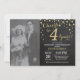 4e anniversaire de mariage avec photo personnalisée. Invitation tableau noir et or. Quatrième anniversaire de mariage. Fond diamant paillettes noires et or. Confettis dorés. Anniversaire adulte. Fête d'anniversaire homme ou femme. Pour une personnalisation plus poussée, veuillez cliquer sur le bouton "Personnaliser" et utiliser notre outil de conception pour modifier ce modèle.