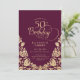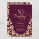 Soirée de 50e anniversaire en or bordeaux. Design classique avec rose, faux feuille d'or et police de script de typographie. Carte invitation tendance parfaite pour une célébration anniversaire élégante. Personnalisez avec vos propres détails. Peut être customisé à n'importe quel âge. Invitations Zazzle imprimées ou téléchargement instantané modèle imprimable numérique.