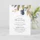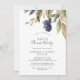 Cette invitation d'anniversaire de mariage de 50 ans de verdure d'automne est parfaite pour une fête d'anniversaire d'automne. Le design rustique moderne présente des feuilles de navire bleu, de sauge verte et d'or avec des brindilles de fleurs bleu foncé.