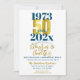 Une magnifique fête du 50e anniversaire de mariage ou une invitation à célébrer. Un superbe design de typographie à effet bleu et or avec beaucoup d'espace pour les détails de votre fête - parfait pour annoncer une célébration pour une fête du cinquantième anniversaire. Cette élégante invitation par carte à plat présente des dates mariages et actuelles pour le 50e anniversaire.