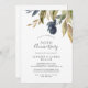 Cette invitation pour le 50e anniversaire de mariage avec verdure d'automne est parfaite pour une fête d'anniversaire automnale. Le design rustique moderne présente des feuilles de couleur or, vert sauge et bleu marine avec des fleurs bleues foncées.