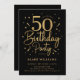 50th birthday party invitation in black and gold. Trendy modern design, perfect for a stylish men's or women's bday celebration. Features script font and confetti. Customize with your own details. Printed Zazzle invitations or instant download digital printable template.