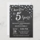 5e anniversaire de mariage Invitation tableau noir et argent. Cinquième anniversaire de mariage. Fond de diamant pailleté noir et argent tableau noir. Confettis argentés. Anniversaire adulte. Fête d'anniversaire pour homme ou femme. Pour une personnalisation supplémentaire, veuillez cliquer sur le bouton "Personnaliser" et utiliser notre outil de conception pour modifier ce modèle.