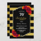 Dîner de 70e anniversaire rayé noir et or invité avec élégants affichages floraux rouge et orange. Le texte est entièrement personnalisable pour vous permettre d'inclure toutes vos propres informations pour la célébration de votre anniversaire. (NB : Faux parties scintillant a été présenté sur cette invitation.)