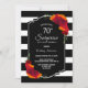 Dîner de 70ème anniversaire à rayures noires et blanches avec élégants étalages de fleurs rouges et oranges. Le texte est entièrement personnalisable pour vous permettre d'inclure toutes vos propres informations pour la célébration de votre anniversaire.
