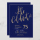 Cette fabuleuse invitation de 75e anniversaire de bleu marine pour hommes qui dit "Fêtons !" dans une police d'écriture moderne en or serait parfaite pour célébrer l'homme à l'75e anniversaire de votre vie. Cette invitation est tendance, design, moderne et contemporaine. Pour voir vos invitations personnalisées sélectionnez "Personnaliser ce modèle" et entrez vos informations. C'est super facile !