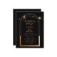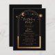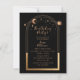 80e anniversaire Quatre-vingt-dix Celestial Mystical Black Gold Sun Moon Astronomie Birthday Invitations Invitations présente soleil doré, lune et étoiles avec un cadre doré sur un arrière - plan noir. À l'intérieur, vous trouverez vos informations d'invitation d'anniversaire personnalisées. Conçu pour vous par Evco Studio. Afficher la collection de coordination à l'adresse www.zazzle.com/store/evcostudio