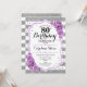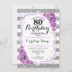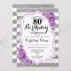 Invitation du 80e anniversaire. Elégant design de lavande blanche argentée avec fausse parties scintillant. Bandes d'argent et de blanc avec roses violets. Parfait pour une soirée de quatre-vingts ans.