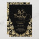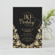 Soirée de 80e anniversaire en or noir. Design classique avec rose, faux feuille d'or et police de script de typographie. Carte invitation tendance parfaite pour une célébration anniversaire élégante. Personnalisez avec vos propres détails. Peut être customisé à n'importe quel âge. Invitations Zazzle imprimées ou téléchargement instantané modèle imprimable numérique.