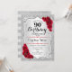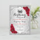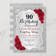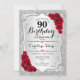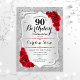 90e Invitation d'anniversaire. Design élégant en argent et en rouge. Comprend des bandes d'argent faux parties scintillant, des roses rouges police de caractères stylisés et des confettis. Parfait pour une fête d'anniversaire glam.