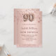 Une invitation moderne, élégante et glamour pour une fête de 90ème anniversaire. Un arrière - plan métallique à l'or rose faux avec de l'or rose et des étoiles à gouttes roses et une bande de parties scintillant. Le nom est écrit avec un rose moderne de couleur or foncé à la main écriture style. Personnalisez et ajoutez les détails de votre fête. Le numéro 90 est écrit avec une police de style ballon, script.