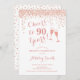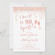 90e Invitation d'anniversaire. Salutations À 90 Ans ! Design élégant en or blanc et rose. Il comprend des verres à champagne, des caractères de script et des confettis. Parfait pour une soirée de quatre-vingt-dixième ans. Personnalisez avec vos propres détails. Peut être customisé pour montrer n'importe quel âge.
