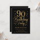 90th birthday party invitation in black and gold. Trendy modern design, perfect for a stylish men's or women's bday celebration. Features script font and confetti. Customize with your own details. Printed Zazzle invitations or instant download digital printable template.