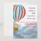 L'invitation à la baby shower présente un ours mignon dans une montgolfière volant au-dessus des nuages décrivant l'arrivée du bébé.