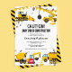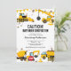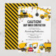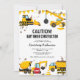 Cartes d'invitation pour une baby shower sur le thème de la construction avec un fond blanc simple, des illustrations mignonnes de fanions, de panneaux d'arrêt, d'un camion à benne, d'une pelleteuse, d'un camion toupie, d'une grue à boule de démolition, de projections de terre et d'un modèle moderne 'bébé en construction' facile à personnaliser.
