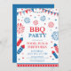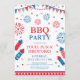 Invitation à une fête de barbecue festive du 4 juillet avec cadre de bordure, drapeaux et feux d'artifice isolés sur fond blanc. Conception pour les invitations de la fête de l'Indépendance américaine. Typographie personnalisable en rouge et bleu.