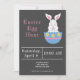 Une invitation personnalisable pour une chasse aux oeufs de Pâques avec l'illustration d'un lapin aux oreilles roses sortant d'un oeuf de Pâques bleu décoré de fleurs ! Un poussin jaune est imprimé sur le dos ! Il sera plus facile d'envoyer les invitations à votre chasse aux oeufs de Pâques.