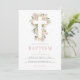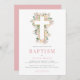 Une belle invitation au baptême pour votre fille avec une croix blanche avec de jolies fleurs roses et des feuilles verts derrière, comme point focal. Personnalisez avec vos détails en rose et gris.