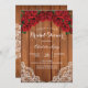 Elégante invitation au bois rustique et à la dentelle décorée de roses rouges.