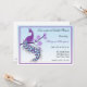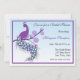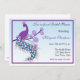 Une invitation à la douche nuptiale avec paon violet avec plumes bleues et violettes, assise sur une branche avec fleurs violettes claires sur arrière - plan bleu pâle avec bordure violette. Facile à customiser pour toutes les occasions. Quelques graphiques ©Riefka Designs