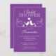 Commencez votre douche nuptiale moderne et élégante avec notre vintage invitation à la douche nuptiale aux inséparables blancs, avec une élégante paire de inséparables chics et un coeur assis sur une branche de parchemin fleurie sur un arrière - plan violet. customisez simplement notre invitation avec vos informations wedding showers et vous êtes tous prêts à partir.