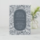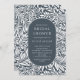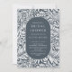 Motif moderne feuille et fleur avec un ovale élégant encadrant vos informations de fête en bleu marine et blanc.