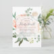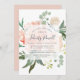 Élégante et moderne invitation à la douche nuptiale fleurie présente un bouquet de douces pivoines pastel dans les tons rose pâle, pêche et crème, avec des feuilles botaniques verdoyants et eucalyptus. Vos détails de douche nuptiale sont superposés sur un élément blanc pur dans un élégant lettrage bleu fumée accentué de calligraphie de style manuscrit.