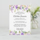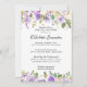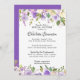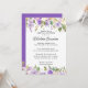 Très jolie combinaison de roses violets foncés, de roses violets clairs et de fleurs blanches en ivoire. Elles sont toutes nichées dans une variété de feuilles verts. Ensemble, ils créent des bordures florales le long du haut et du bas de cette invitation à la douche nuptiale. Le nom de la mariée est écrit en gros caractères. Le dos de l'invitation est violet royal avec les plus petits points blancs. La frontière florale se poursuit également le long du fond.