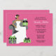 Invitation les invités pour une douche nuptiale dans le style avec cette invitation à la douche nuptiale moderne et amusante. Cette invitation rose et verte présente une mariée afro-américaine assise sur une chaise entourée de cadeaux.