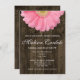 Je recommande fortement le type de papier COLUMNED ou FELT. | Voici une invitation unique de douches pour une mariée de campagne. Elles présentent un décor rustique en bois de grange imprimé avec une marguerite rose en gerbéra au sommet. Elles sont idéales pour les épouses qui auront un mariage de style champêtre ou qui utiliseront des fleurs de marguerite gerbère dans leur mariage. Ajoutez simplement les détails de votre douche à cet modèle.