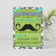 Invitation pour la fête d'anniversaire Mustache Bash Chevron. Votre fête sera la coqueluche quand tout le monde apportera sa moustache à la fête d'anniversaire. Cette invitation d'anniversaire pour garçon présente un fond gris neutre avec des étoiles à profusion et une superposition verte en chevron qui contient tout le texte de votre fête. Une bannière grise vers le haut indique "Fête d'anniversaire" au cas où quelqu'un se poserait la question. Le texte serif bleu, noir et blanc est disposé dans un style d'affiche très tendance et branché et une énorme moustache se démarque également sur cette invitation. Une invitation très hipster pour n'importe quelle fête d'anniversaire, que vous soyez adulte ou enfant !