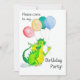 Une invitation à la fête d'anniversaire avec un dragon vert et jaune joyeux avec des ballons, à partir d'une illustration aquarelle de Judy Adamson.