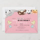 Fête d'anniversaire rose de la jeune fille Invitation. Animaux Jetant un oeil au-dessus du sommet. Âge sur ballons. Aquarelle. Marguerites.