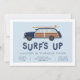 Les invitations pour les fêtes d'anniversaire d'été pour les surfs de votre petit garçon ou de la plage avec une voiture vintage en bois en bleu marine, avec une planche de surf sur le dessus. "Surf up" apparaît dans les lettres rétro, avec les détails de votre fête d'anniversaire en dessous.