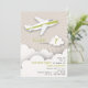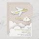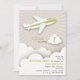 Une invitation à la fête d'anniversaire illustrant un avion blanc à rayure verte survolant les nuages. Personnalisez le texte.