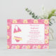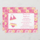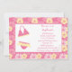 Ce invitation de fête de 5x7 a un arrière - plan de fleurs d'hibiscus rose et jaune. Il y a un bikini à côté des informations personnalisables sur la fête. Cocoa Studio